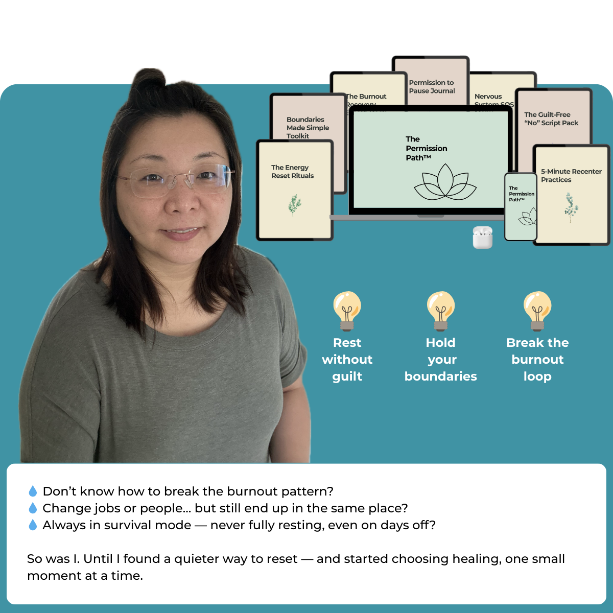 Most burnout programs ask you to pause your life or pay thousands for retreats. The Permission Path™ starts with one small tool you can use in the next 10 minutes—then gently turns it into daily habits that actually stick. No guilt. No big changes. Just simple resets that work with your real schedule. This isn’t about fixing you or making you someone new. It’s about helping you remember who you are underneath all that exhaustion.